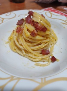 Quando sono pronti, il grassetto della pancetta si è ben sciolto, la pasta (a me piace il formato spaghettone) è al dente, si scola e si mescolano in una insalatiera pasta, uovo e pancetta. Se siamo stati bravi viene una cosa strepitosa, cremosa e senza grumi. Sennò ce la mangiamo lo stesso, alla carbonara non si dice mai di no.
