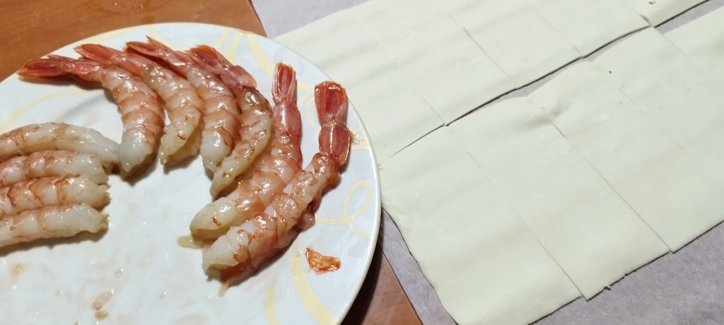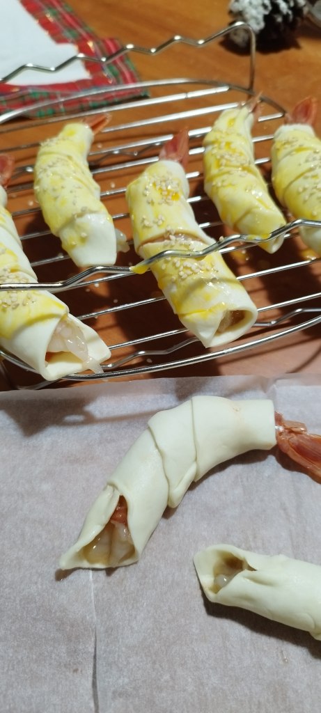 Sciacquateli ed asciugateli. Tagliate delle striscioline di pasta sfoglia (dal lato corto) ed arrotolateci i gamberi. Spennellate con l’uovo, decorate coi semini e via in forno a 180° fino a doratura. Di grande effetto, ma facilissimi!